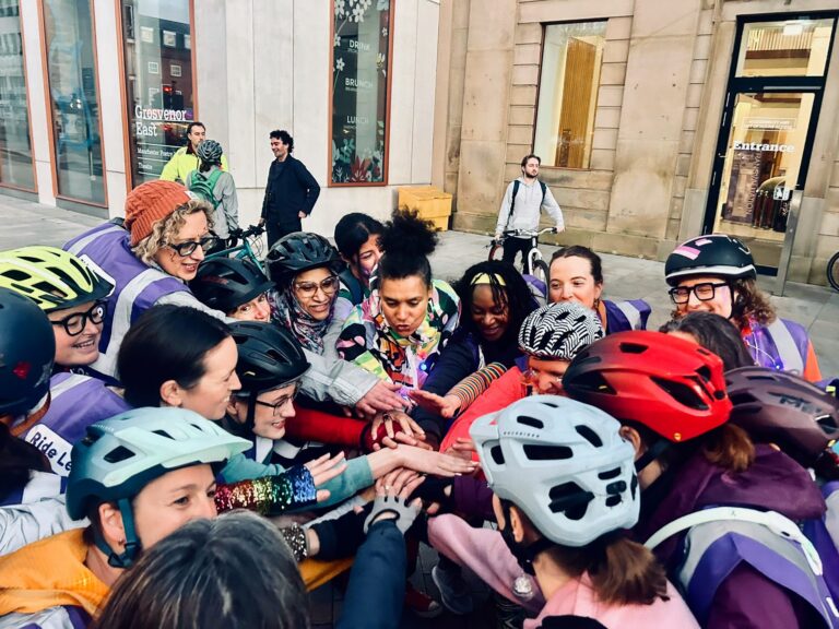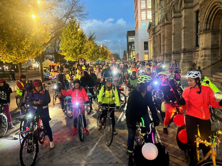 We are still slowly coming down from the explosion of empowering night energy from Lights Up on 8th November! Our collaborated event with Bee Pedal Ready illuminated the night on wheels with over 200 cyclists, weaving through the darkest corners of the city and reclaiming the night before heading over to Victoria Baths for bike poetry, hot food and brews as well as an incredible exhibition by MMU students in response to the Lights Up movement. It couldn’t have been done without the remarkable 35 volunteer ride marshalls, first aiders and mechanics > we salute you! And we are already plotting the fourth edition on 7th November 2026, so grab yourself an early diary entry!